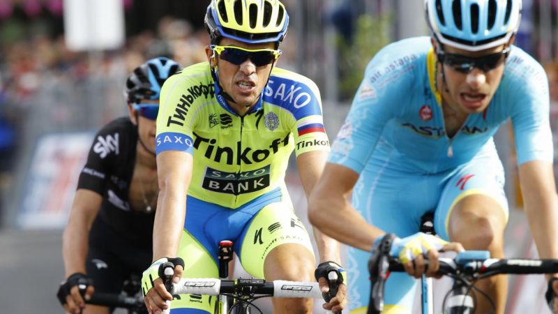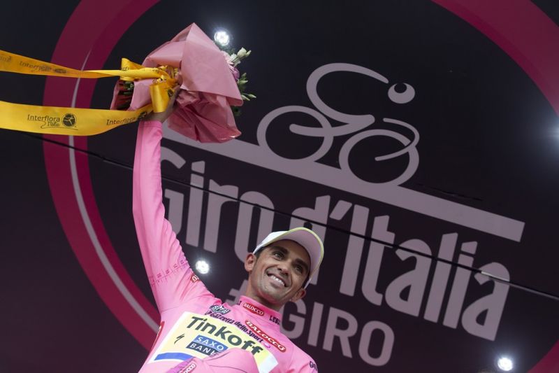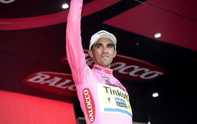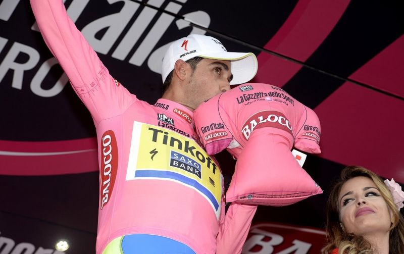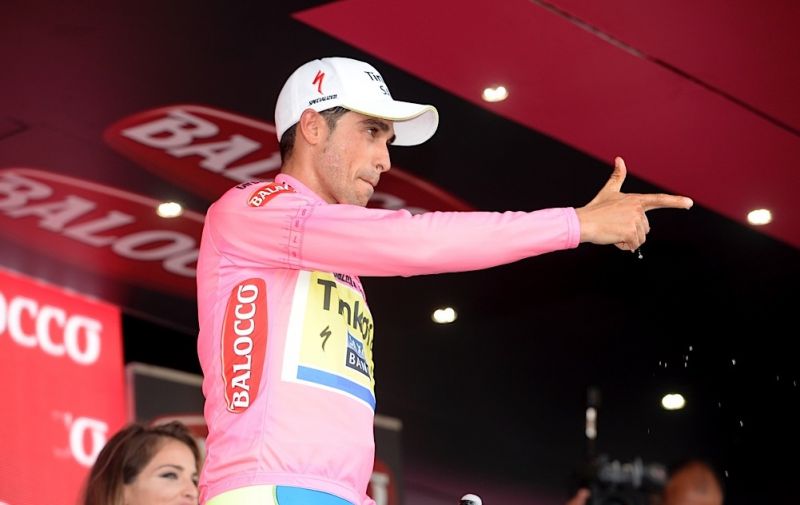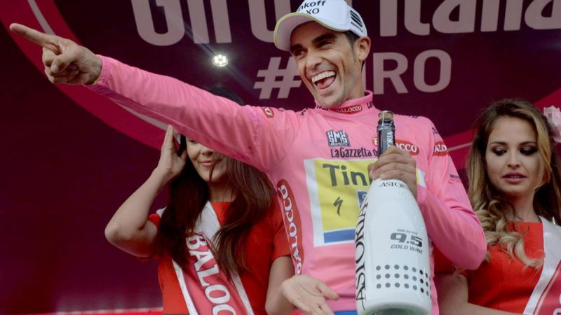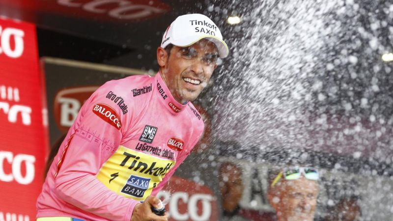 De roze trui verwisselt van schouders. Alberto Contador is de nieuwe klassementsleider. (foto: Sirotti)