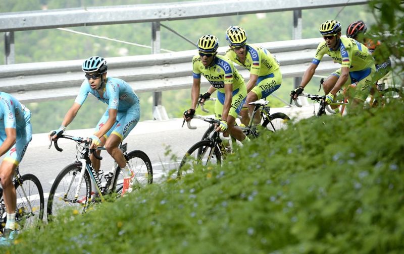 Aru en Contador worden in het peloton omringd door ploeggenoten. (foto: Sirotti)