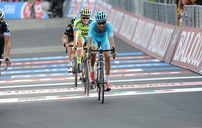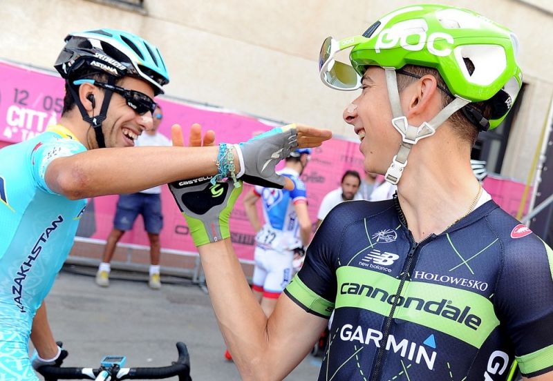Formolo wordt nog eens gefeliciteerd door die andere jonge Italiaanse held, Fabio Aru. (foto: RCS)