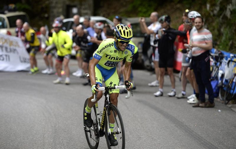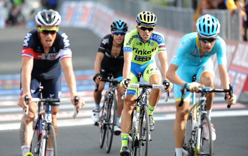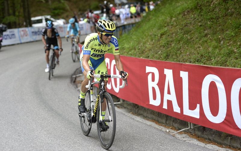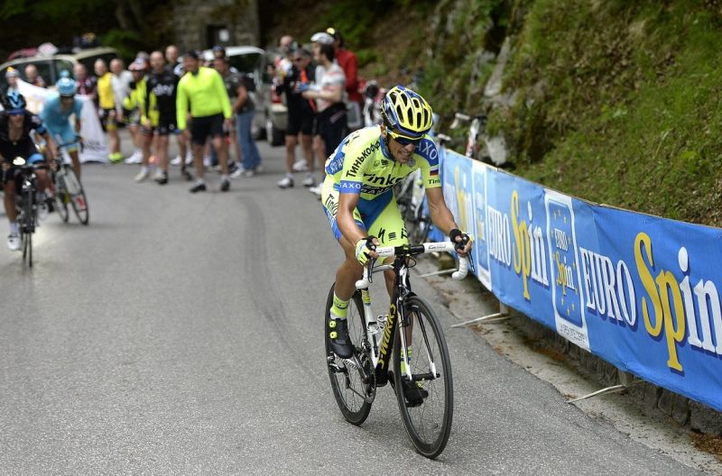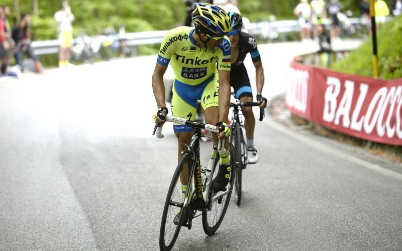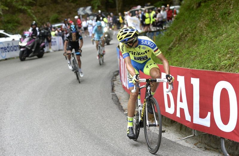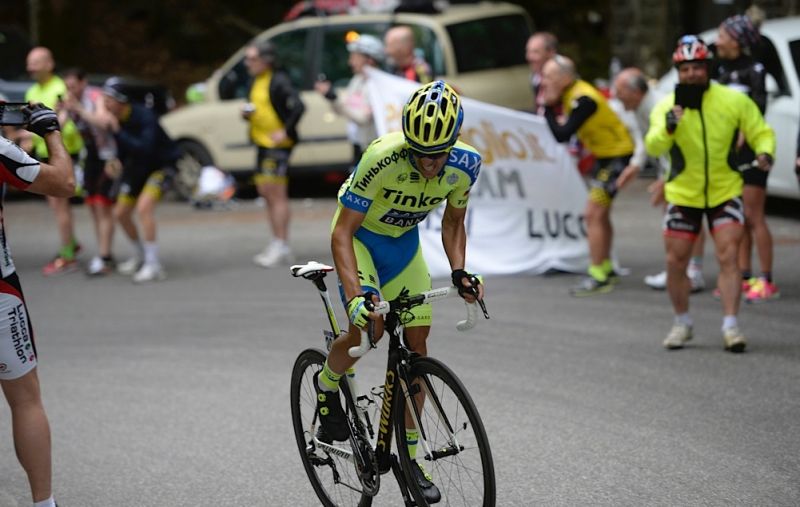 In een bocht geeft de Tinkoff-Saxo-renner gas. (foto: Sirotti)
