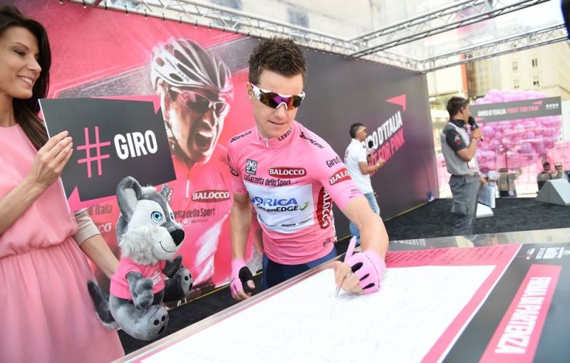 De roze trui-drager tekent de startlijst. (foto: ANP)