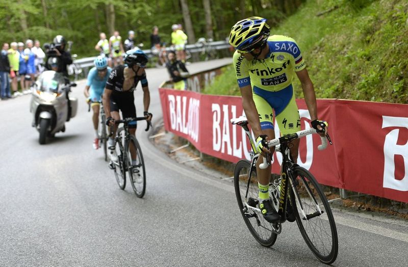 Contador kijkt achterom en ziet de twee naderen. (foto: Sirotti)