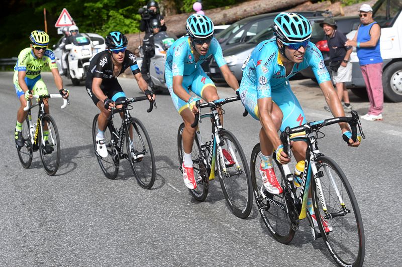 Groep favorieten met Contador in het wiel van Aru op de slotklim. (foto: Sirotti)