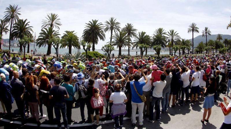Het peloton bij de start in La Spezia. (foto: ANP)