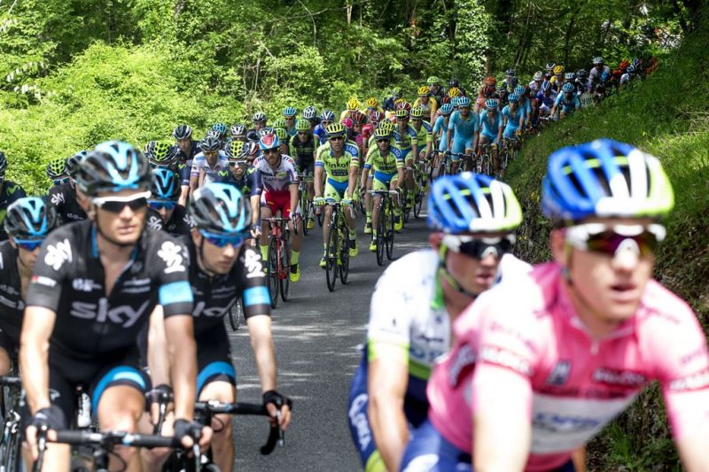 Ploegvorming in het peloton, Orica, Sky, Tinkoff en Astana klitten samen. (foto: ANSA-Peri)