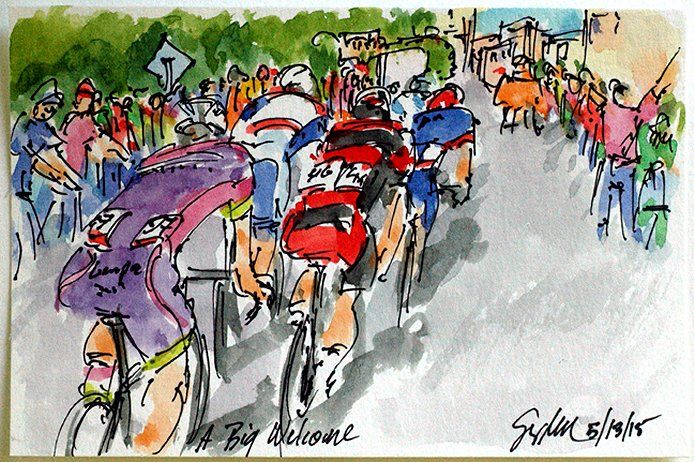 "A Big Welcome" (by Greig Leach): de kopgroep wordt hartelijk ontvangen in een dorpje langs de route.