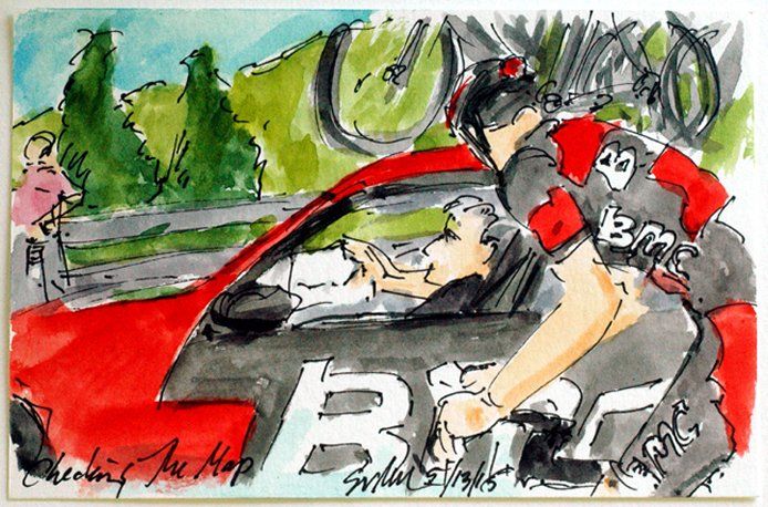 "Checking The Map" (by Greig Leach): Silvan Dillier neemt samen met ploegleiding de route door.