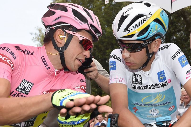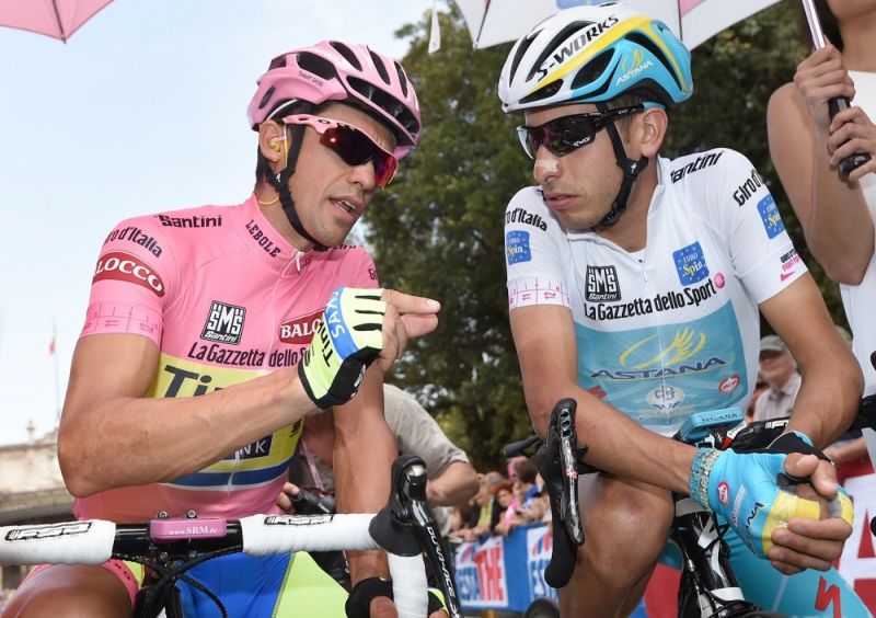De twee concurrenten Contador en Aru schudden elkaars hand voorafgaand aan de etappe. (foto: Sirotti)