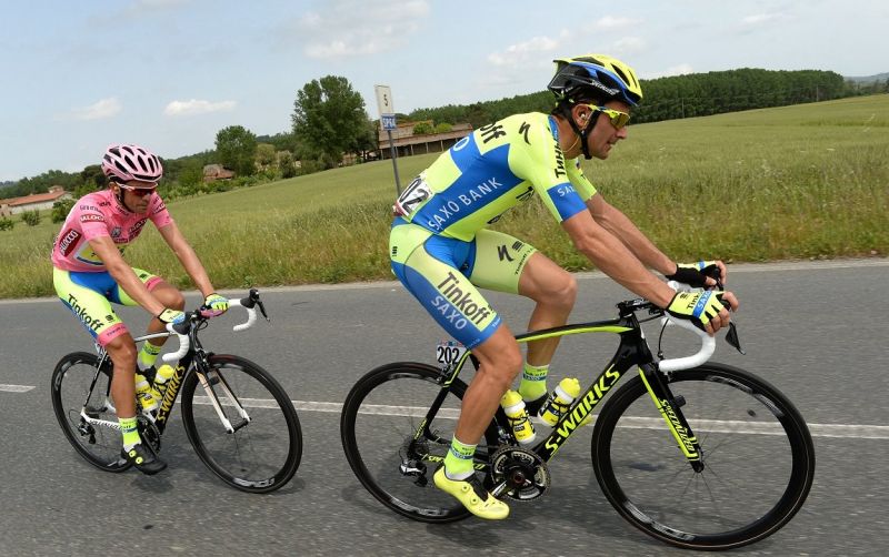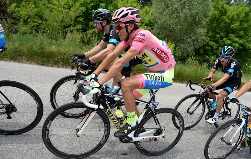 Contador rijdt in het peloton in het spor van oud-Giro winnaar Ivan Basso. (foto: Sirotti)