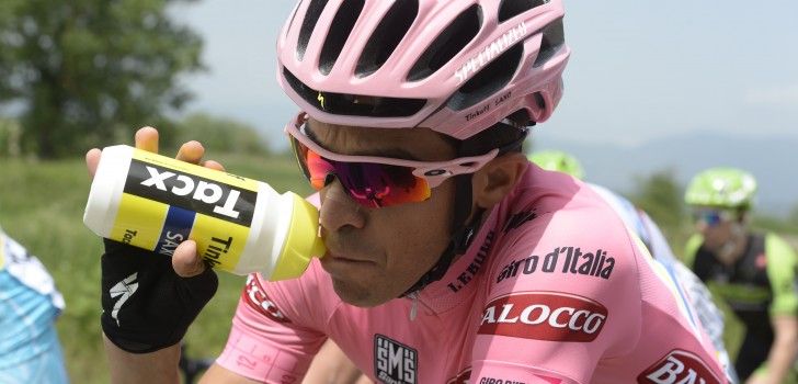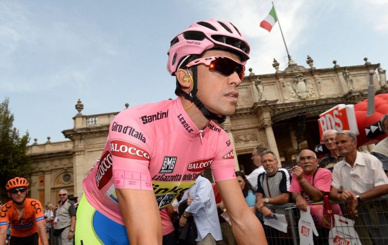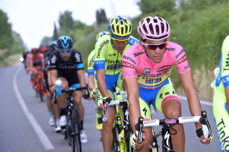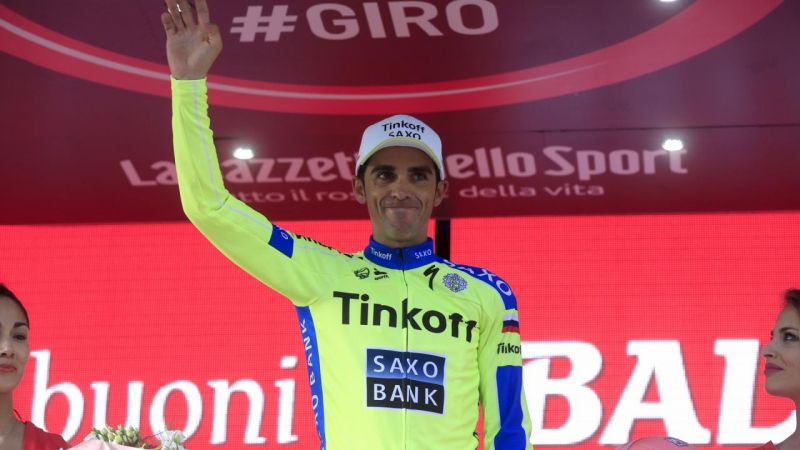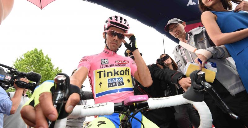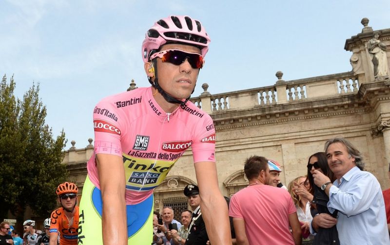 Alberto Contador bij de start van de etappe in Montecatini Terme. (foto: Sirotti)