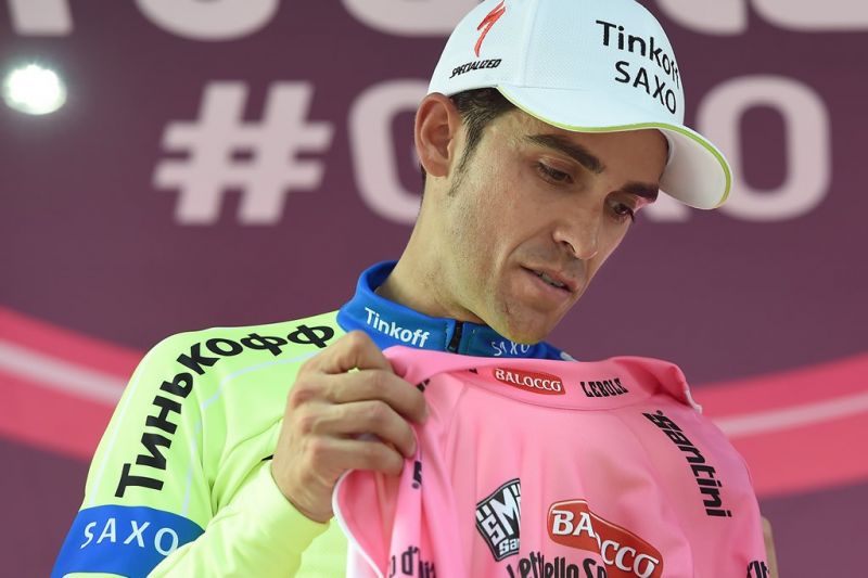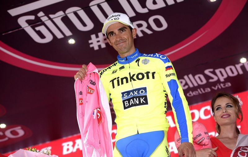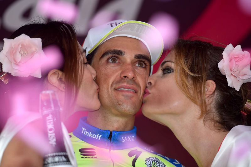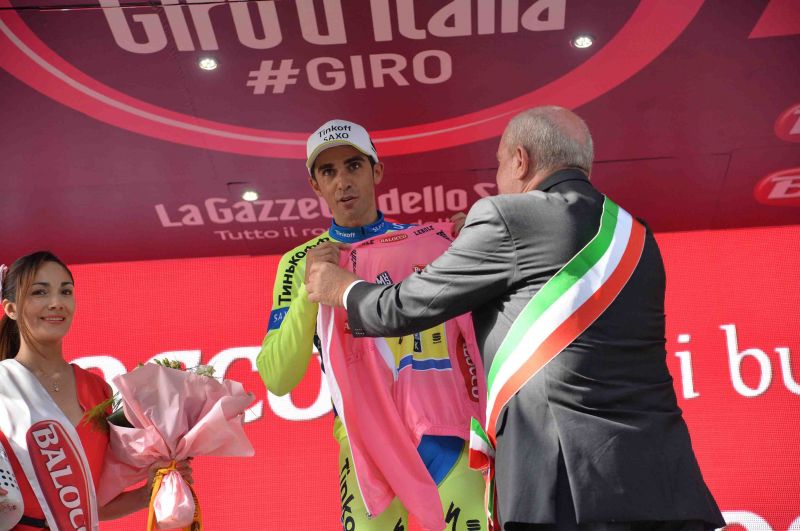 Op het podium krijgt Contador de roze trui uitgereikt. (foto: Giro)