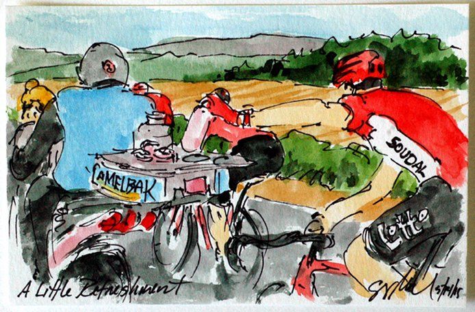 "A Little Refreshment" (by Greig Leach): renners van Lotto-Soudal krijgen drinkbussen aangeleverd.