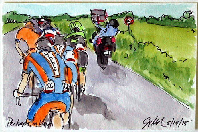 "Perhaps in Vain" (by Greig Leach): kopgroep met Grosu op rug gezien krijgt te zien hoe groot voorsprong is.