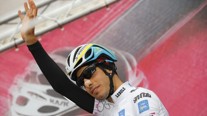 Fabio Aru zwaait op startpodium naar fans. (foto: ANP)