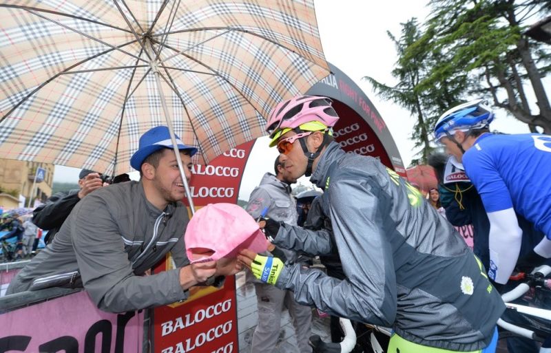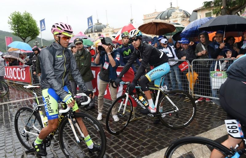 Alberto Contador en Fabio Aru zoeken elkaar op bij de startstreep. (foto: RCS)