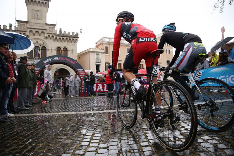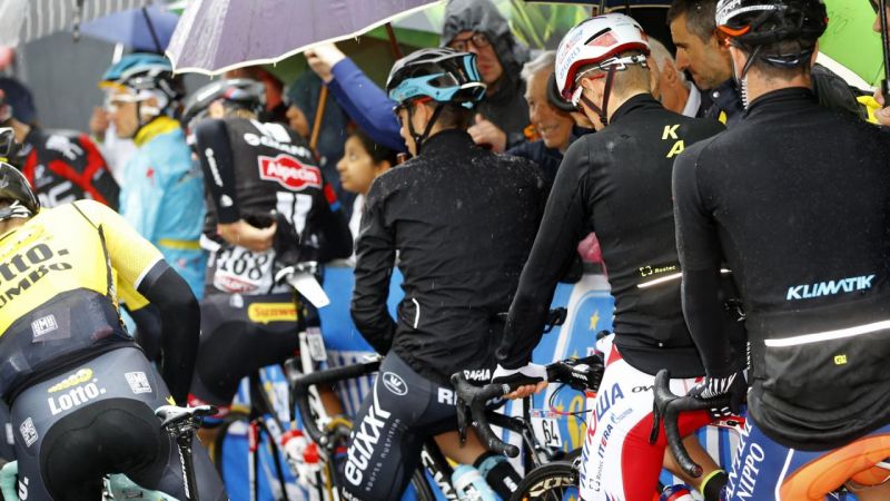 Renners zoeken naar beschtting tegen de regen bij de start in Fiuggi. (foto: ANP)