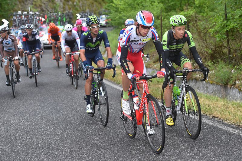 Damiano Caruso en Jonathan Monsalve op weg naar de startplek. (foto: TDWsport)