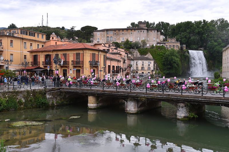 Vlak voor de eerste klim, Forca d'Acero, passeert het peloton Isola del Liri. (foto: TDWsport)