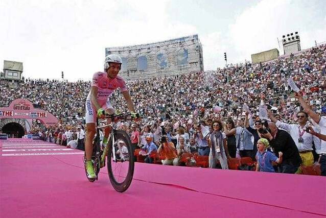 Ivan Basso komt in het roze als winnaar van de Giro d'Italia 2010 over de finish in het amfitheater in Verona.