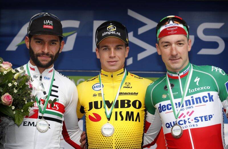De op papier beste sprinter van de wereld staat namelijk aan de start. Elia Viviani wist vorig jaar de meeste overwinningen te boeken van alle profrenners. In de voorgaande Giro wist hij maar liefst 4 ritzeges te behalen en was hij de winnaar van het puntenklassement. Of de Italiaan van Deceuninck-Quick Step intrinsiek ook de snelste van het hele pak is, dat valt te betwijfelen, zeker volgens de man in het geel op onderstaande foto. Helaas voor de Nederlanders is noch Dylan Groenewegen, noch Fabio Jakobsen van de partij.