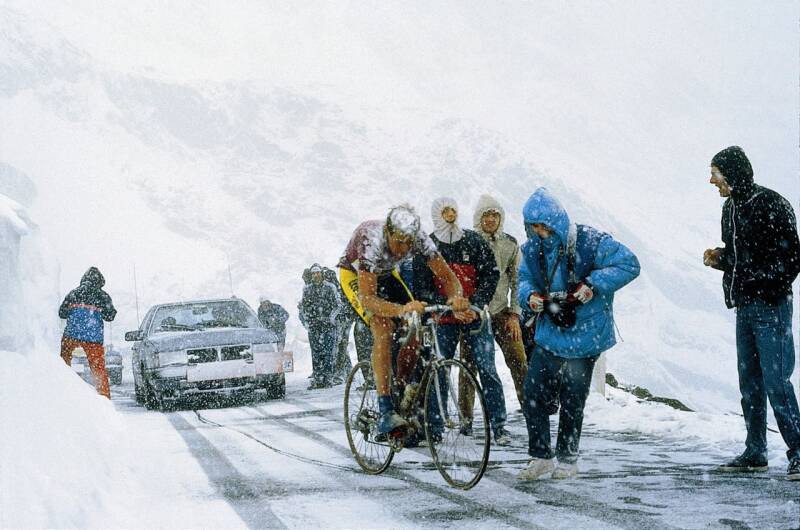 L’uomo di Gavia, de man van de Gavia. Johan van de Velde tijdens zware omstandigheden ploetert op de Gavia omhoog in 1988.